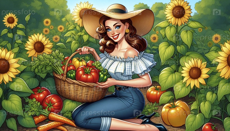 Девушка-принтер в роли садовника, держащего корзину свежих овощей, Ai generated image