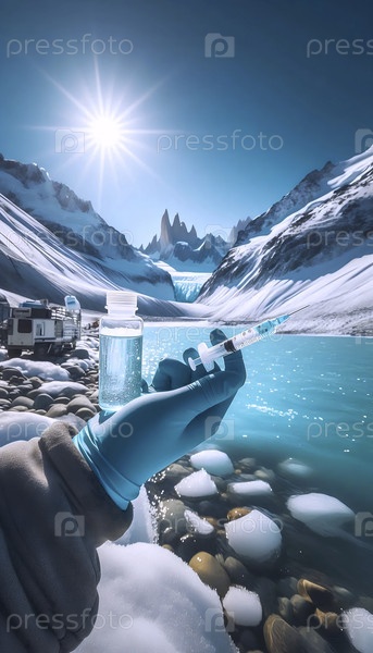 Команда ученых-экологов берет образец воды из нетронутой ледниковой реки, Ai generated image
