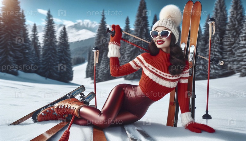 Девушка с пин-апом как лыжник в ретро-ски, позирующая со ски, Ai generated image
