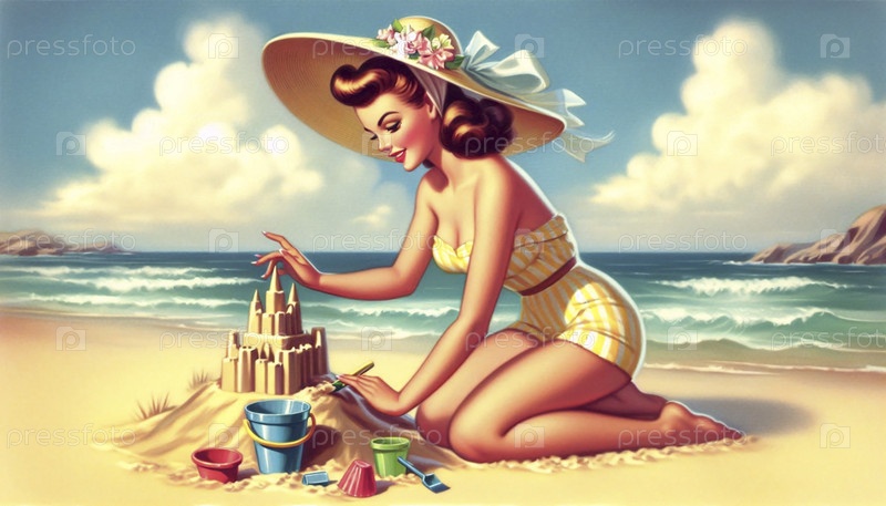 Пин-ап девушка в купальнике строит песчаный замок на пляже, Ai generated image
