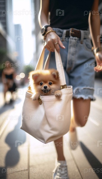 Игровой снимок маленькой собаки, заглядывающей из стильного полотенца на городскую улицу, Ai generated image