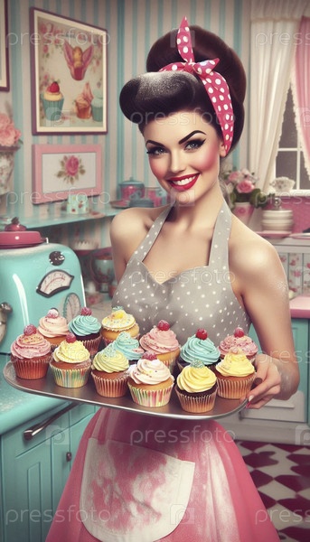 Пин-ап девушка как пекарня, держащая поднос с идеальными тортами, Ai generated image