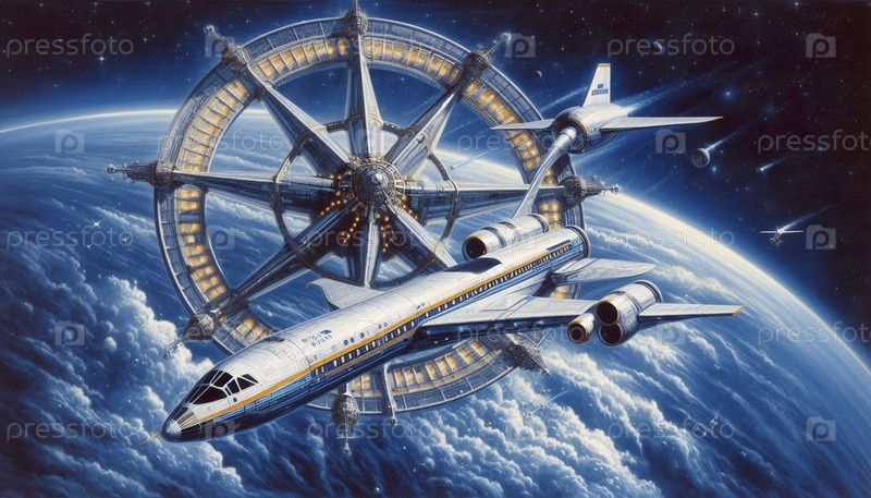 Космический клиппер на орбите над полумесяцем Земля, его туннель посадки подключен к вращающейся космической станции