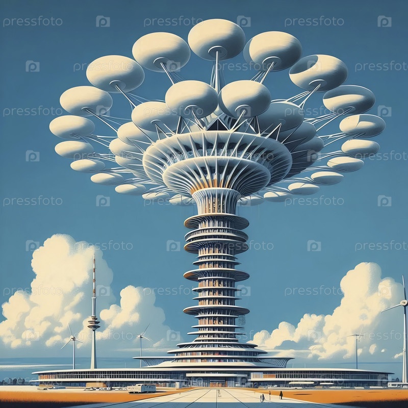 Колоссальная коммуникационная башня в стиле Googie, напоминающая замороженный атомный взрыв, пробивающая облака