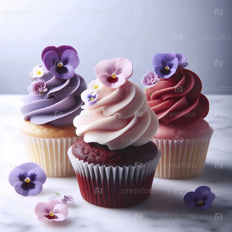 Стол из трех вкусных, безупречно замороженных кексов с небольшим количеством съедобных цветов на мраморной плите Ai создал изображение