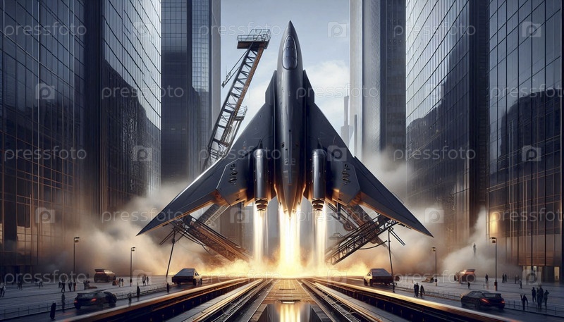 Ракетный самолет в стиле DynaSoar с дельта-крыльями и иглой кабины пилотажа, запускающийся вертикально с столичной площадки, Ai generated image