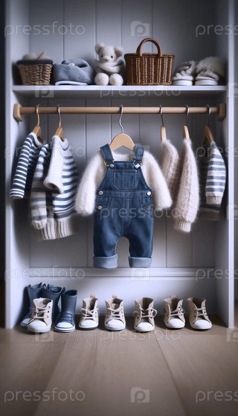 Милый, организованный шкаф с крошечной одеждой на миниатюрных вешальниках и маленькой обувью, выстроенной ниже, Ai generated image