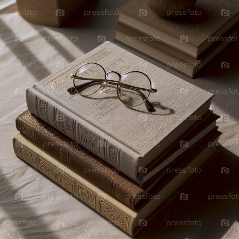 Стол из трех красивых книг в жесткой обложке с текстурированными крышками и парой круглых очков на вершине, Ай создала изображение
