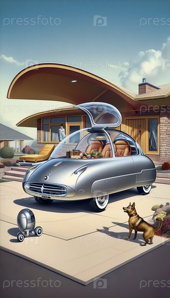Утонченный, семейного размера Aero-Car со складывающимися крыльями, припаркованный на пригородной дорожке будущего, Ai создал изображение