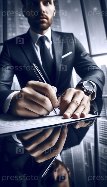 Уверенный в себе предприниматель подписывает крупный контракт, сосредоточившись на решающей руке и ручке