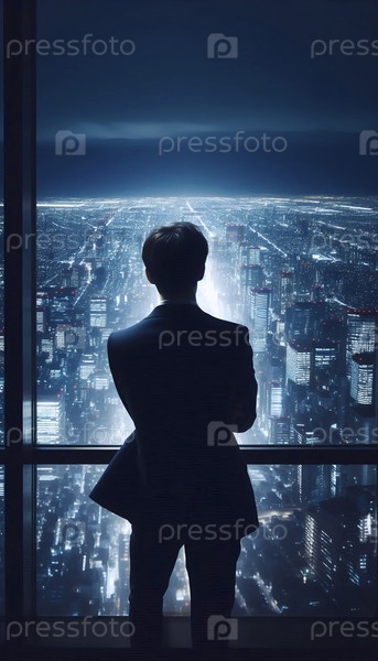 Момент предпринимательских амбиций с видом на яркий, ночной городской пейзаж Ай создал образ