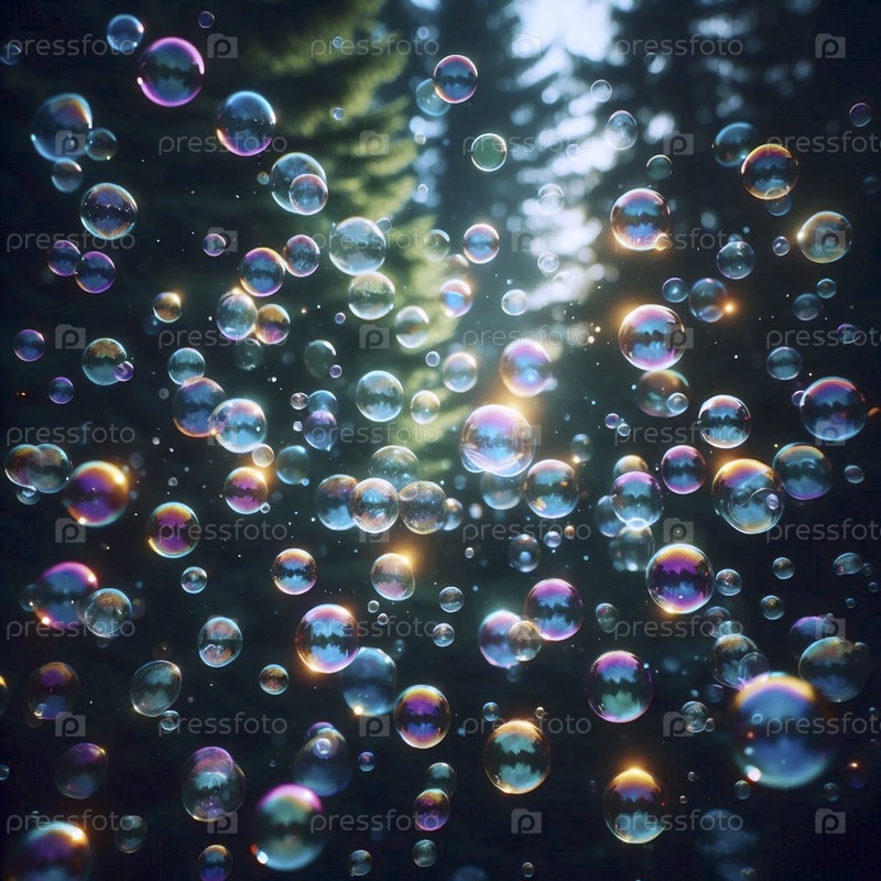 Капризный снимок красочных полупрозрачных мыльных пузырей, плавающих на тёмно-зеленом лесном фоне, Ай создал изображение