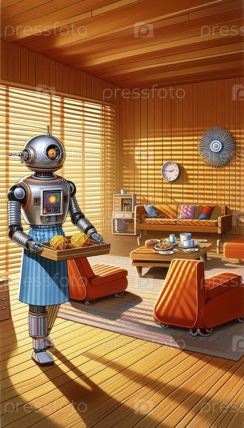 Домашний робот с головой купола и фартуком, подающий завтрак в затонувшей гостиной, Ai generated image