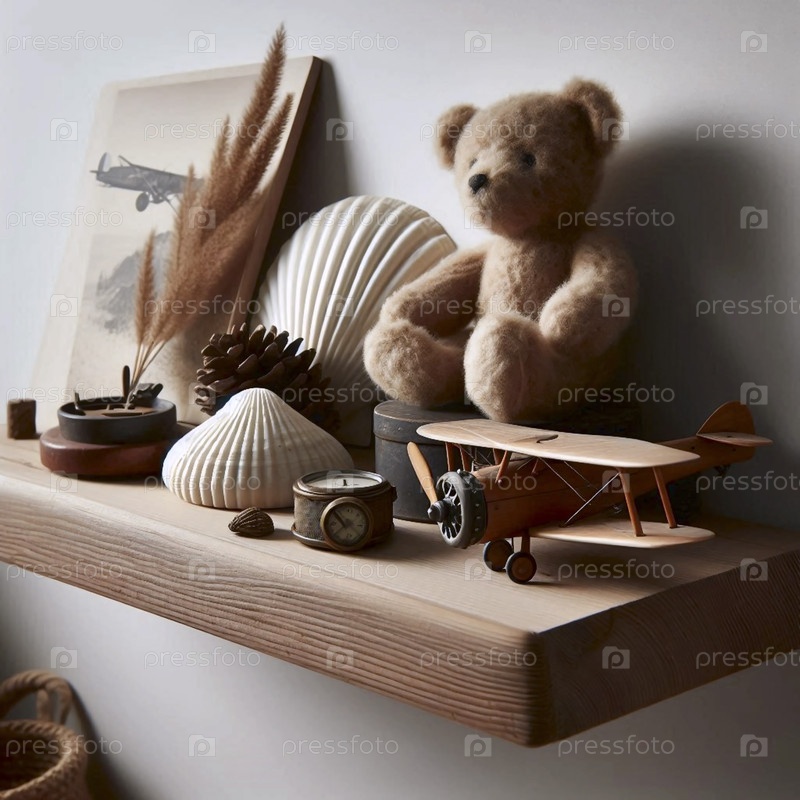 Плавучая полка с драгоценными сокровищами детства: раковина, сосновый конус, модель самолета, Ai generated image
