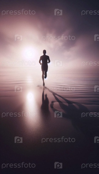 Силуэт одинокого бегуна на туманном пляже при восходе солнца, олицетворяющий свободу и энергию, Ай создал изображение