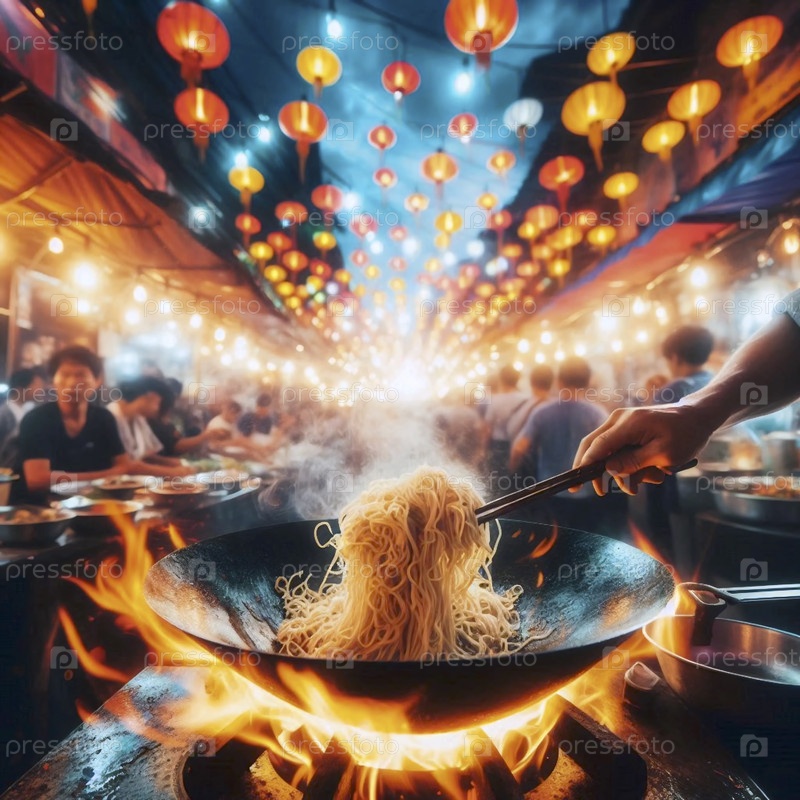 Руки местных продавцов уличной еды готовят традиционное блюдо на оживленном азиатском ночном рынке, Ai generated image