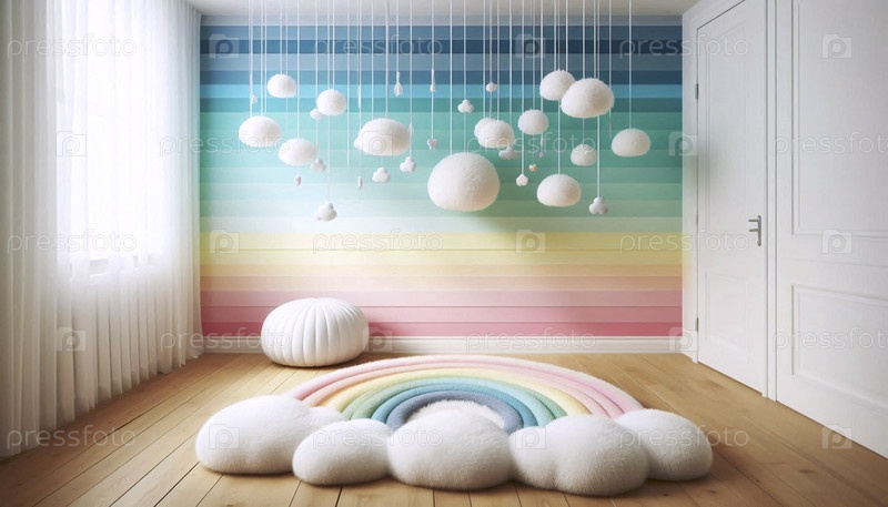 Игровая стена на тему радуги с висящими облаками ткани и пушистым ковром в форме облака, Ai создала изображение