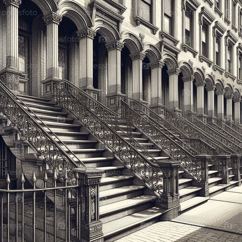 A Row of Brownstone Steps and Railings чернила рисунок художественная печать, Ai создал изображение