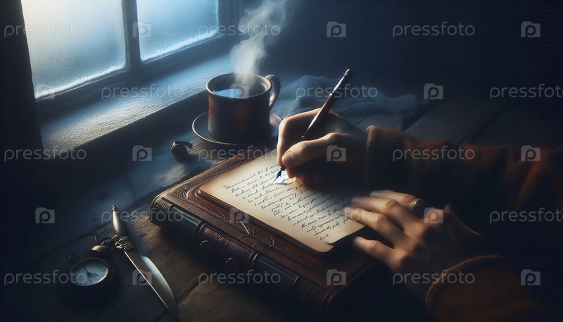 Ранний утренний ритуал писателя: написание романа вручную в уютном углу, Ай создал изображение