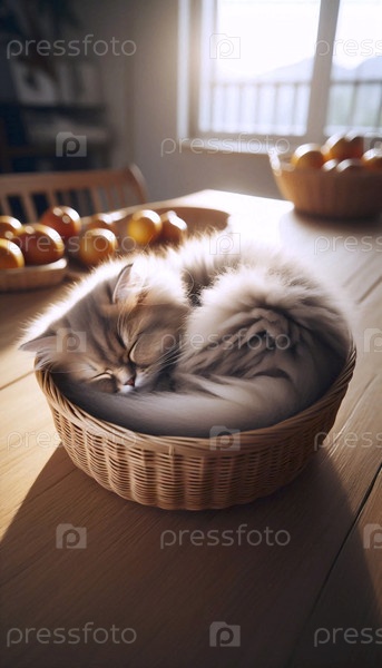Кошка, свернутая и спящая внутри круглой ткани из ротана фруктовой корзины на деревянном столе, Ai generated image