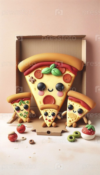Каваи-сцена семьи с кусочками пиццы, Ai generated image