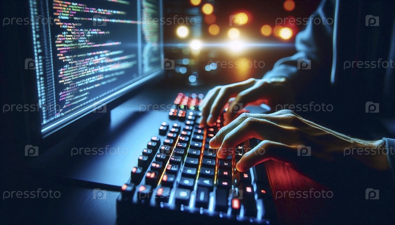 Состояние потока творческих программистов: руки, нависающие над механической клавиатурой с кодом, светящимися на темном экране, Ai generated image