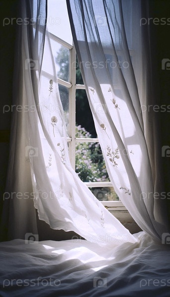 Пара вышитых льняных штор, мягко дующих в ветре от открытого окна, раскрывая солнечный сад, Ай создала изображение