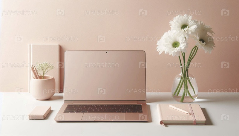 Минималистическое рабочее пространство с пастельно-розовым ноутбуком, одной ромашкой в стакане и изящным блокнотом, Ai generated image