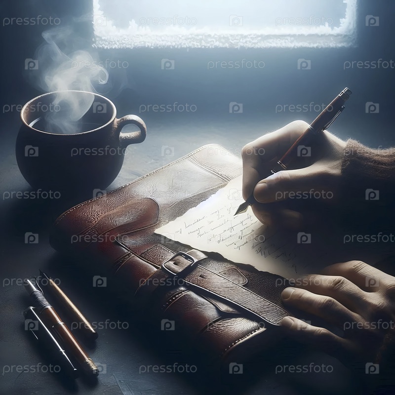 Ранний утренний ритуал писателя: написание романа вручную в уютном углу, Ай создал изображение