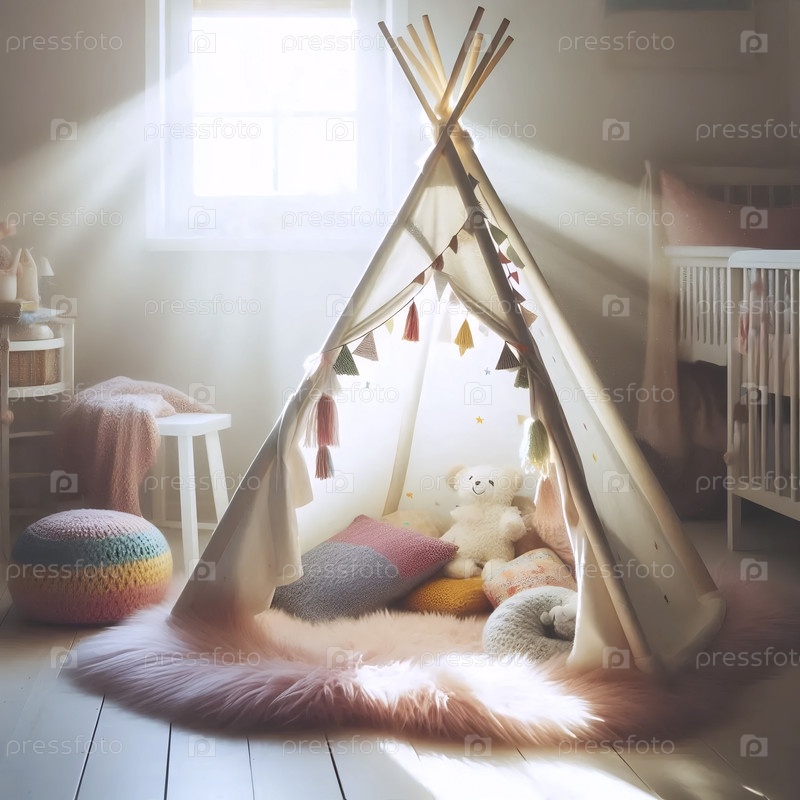 Капризный, солнечный уголок для чтения в детской комнате с типами и плюшевыми подушками, Ai generated image