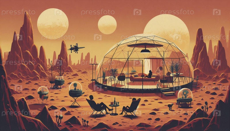 Ретро-футуристическая семья наслаждается заходящим солнцем на пикнике на их марсианском крыльце, Ai generated image