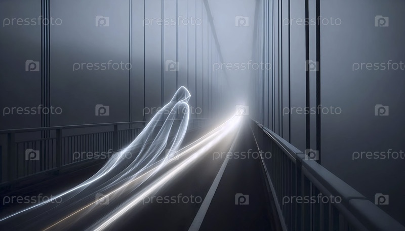 Фотография с длительной экспозицией, на которой фигура в капюшоне пересекает туманный мост, Ai generated image