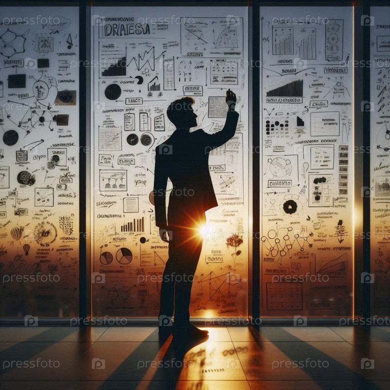 Вдумчивый лидер разрабатывает стратегию, в то время как пишет на стеклянной стене, заполненной схемами и целями