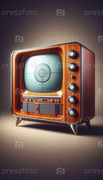 Телевизор из деревянных панелей с большим, выпуклым зеленым экраном и рядами аналоговых циферблат Ai генерирует изображение