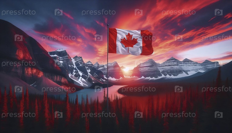 Канадский флаг в северном ландшафте дикой природы, Ai generated image
