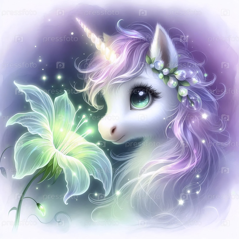 Единорог обнаруживает светящийся цветок акварельный арт-принт, Ai generated image