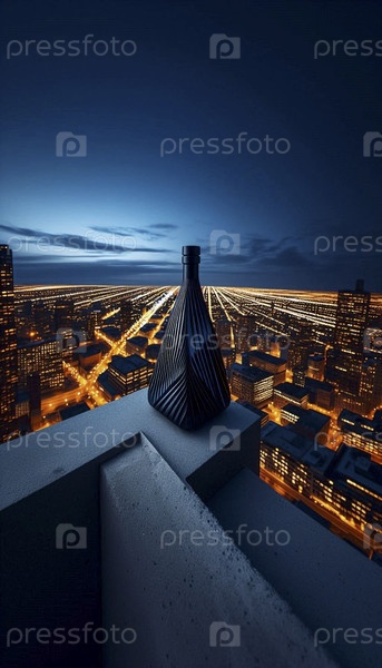 Современный угловой макет бутылки, расположенной на парапете городской крыши во время синего часа, Ай создал изображение