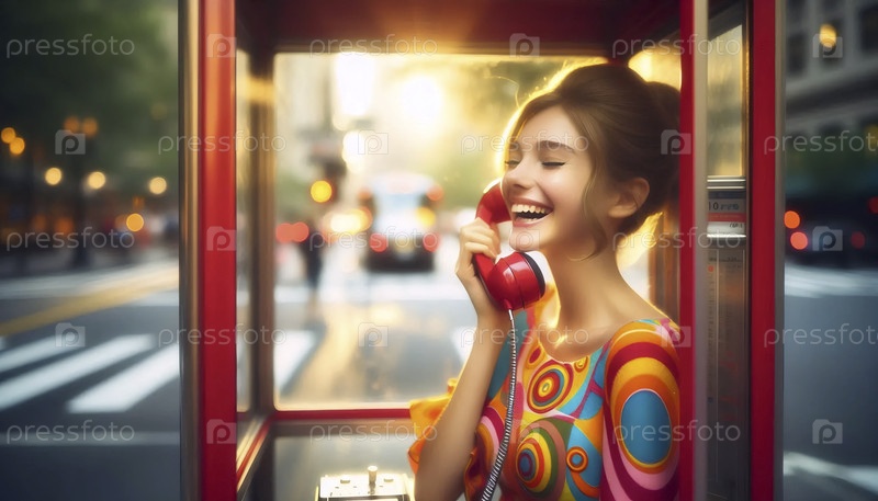 Девушка смеется в телефонной будке, Ai generated image A