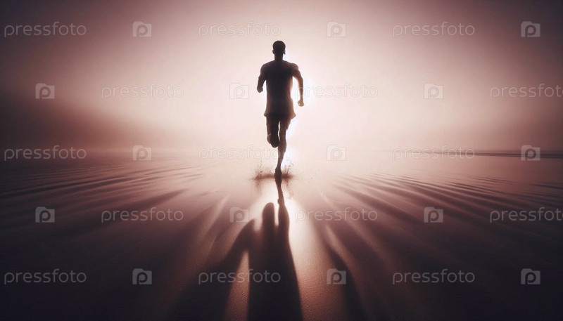 Силуэт одинокого бегуна на туманном пляже при восходе солнца, олицетворяющий свободу и энергию, Ай создал изображение
