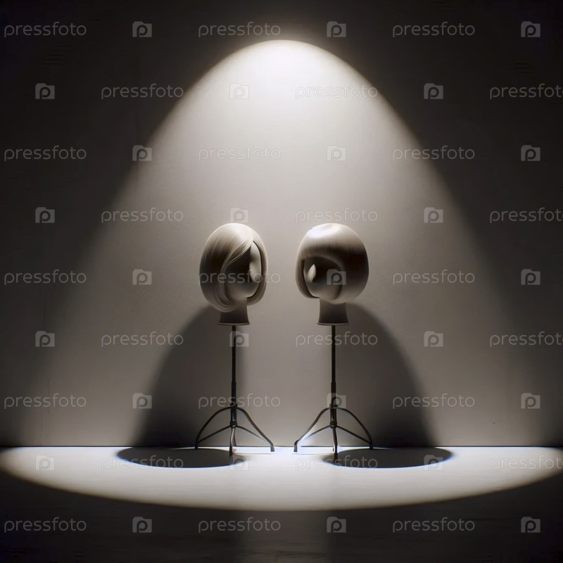 На более широком снимке, показывающем парики на их стойках в пустой комнате, Ай создал изображение