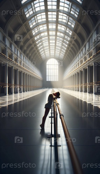 Более широкий снимок пустой студии, танцор опирающийся на бар, отражение небольших деталей, Ай создал изображение