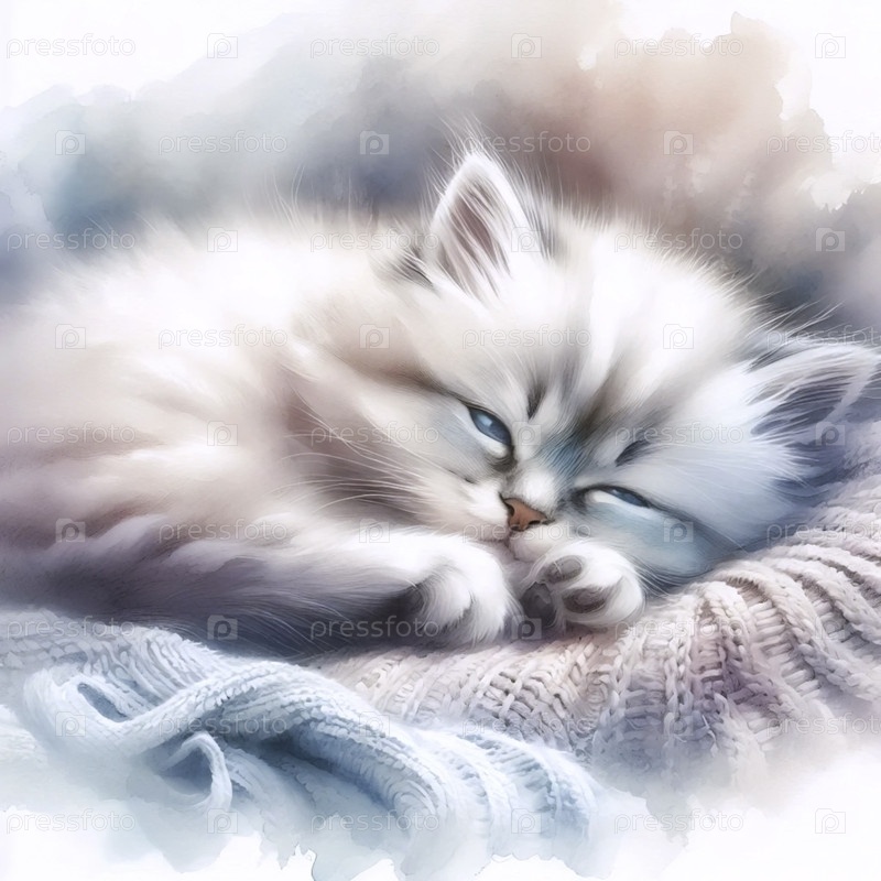 Акварельная живопись спящего пушистого котенка, Ai generated image