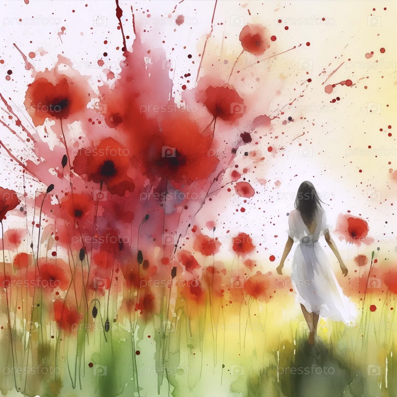 Поле маков, распыляющихся акварелью, Ai generated image