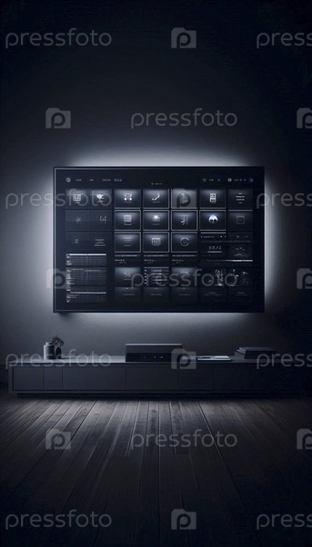 Макет большого телевизионного экрана, отображающий чистую и пустую сетку медиабиблиотеки на темной стене, Ai generated image