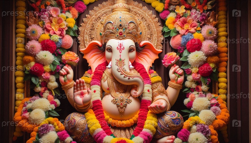 Господь Ганеша с цветочными венками, Ai generated image
