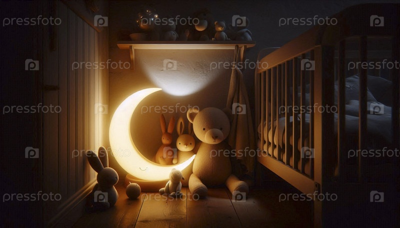 Нежный ночной свет в форме луны, бросающий мягкое свечение на спящих младенцев плюшевых животных, Ai generated image
