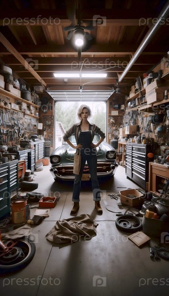 Широкий снимок механика в ее гаражном королевстве, Ай создал изображение