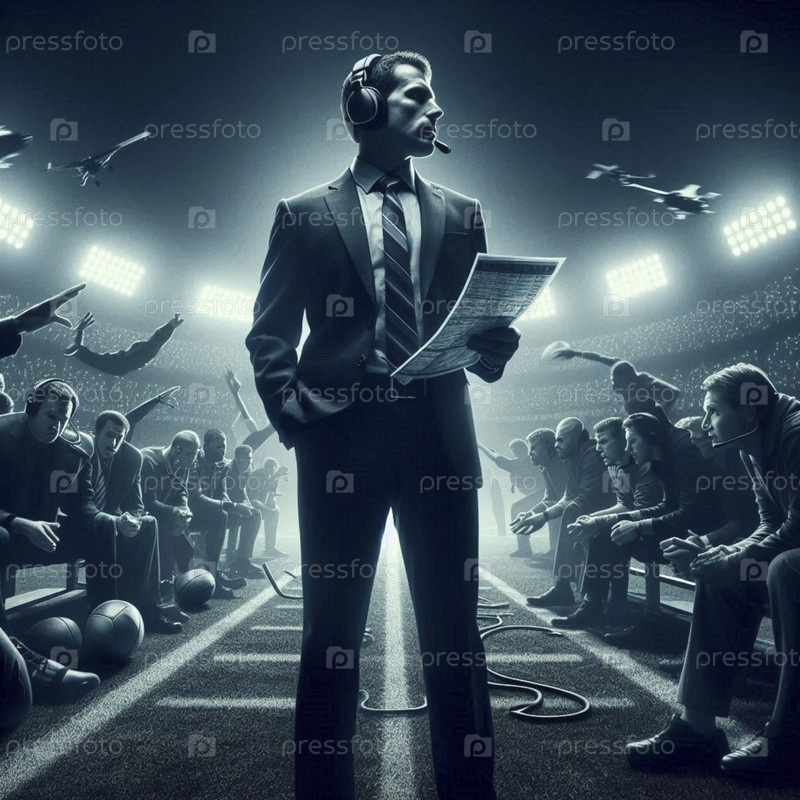 Более широкий кинематографический снимок окружающей среды, сделанный на хаотичной боковой линии стадиона во время финальной игры, Ai создал изображение