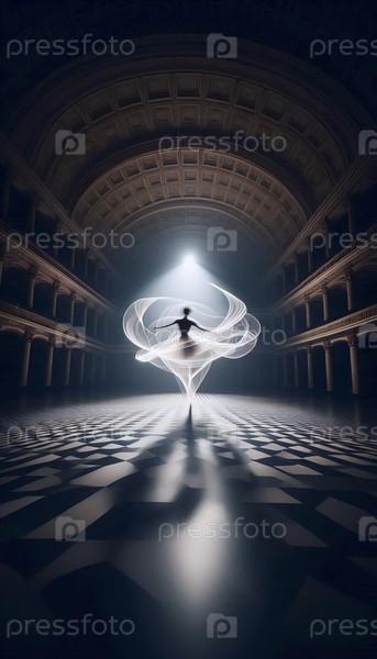 Фотография с длинной экспозицией одинокого танцора в большом зале, Ai generated image
