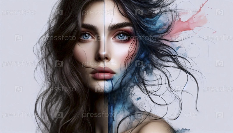 Половина фото, половина акварельный портрет, Ai generated image